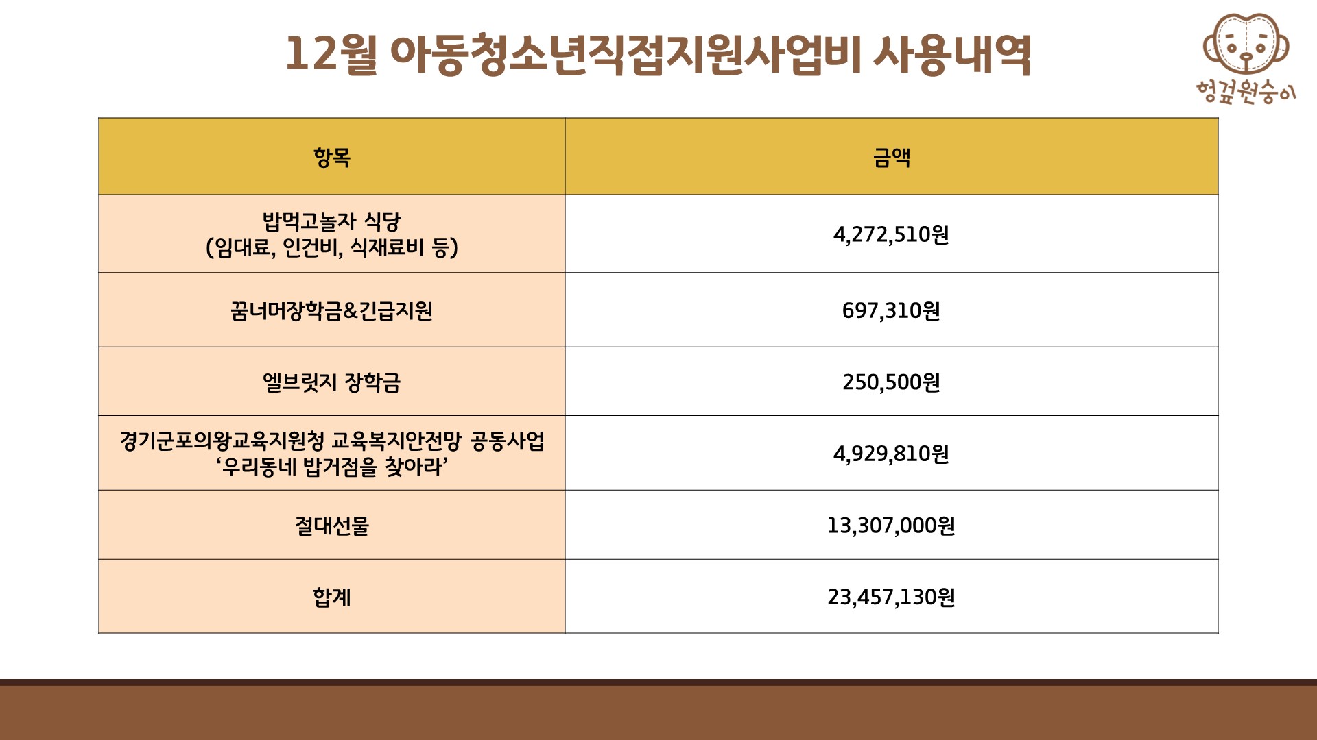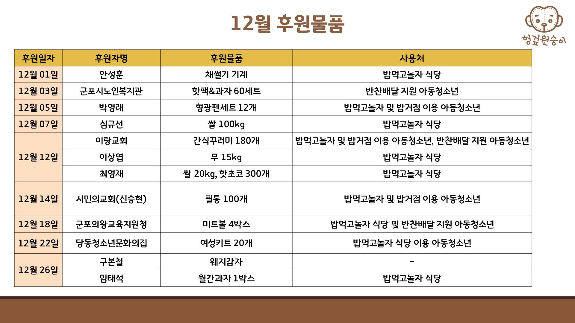 12월 후원물품 후원자&사용처, 아동청소년직접지원사업비 사용내역, 자원봉사자 명단 올려드립니다.