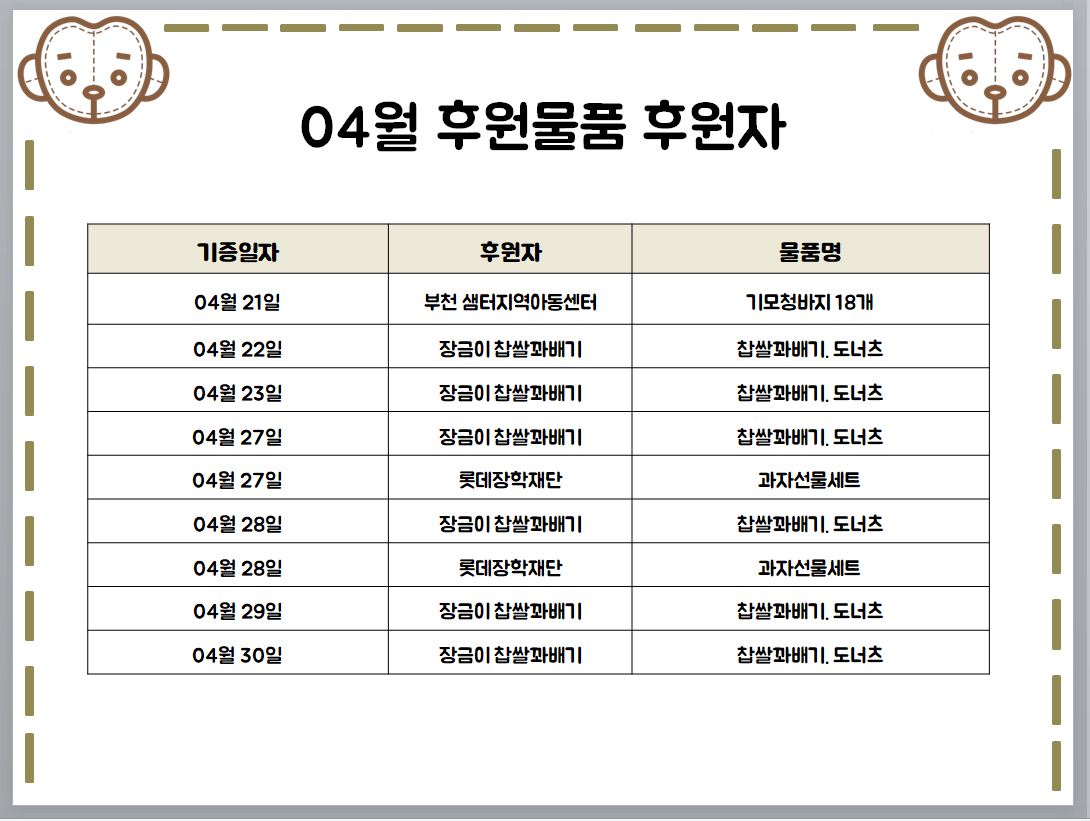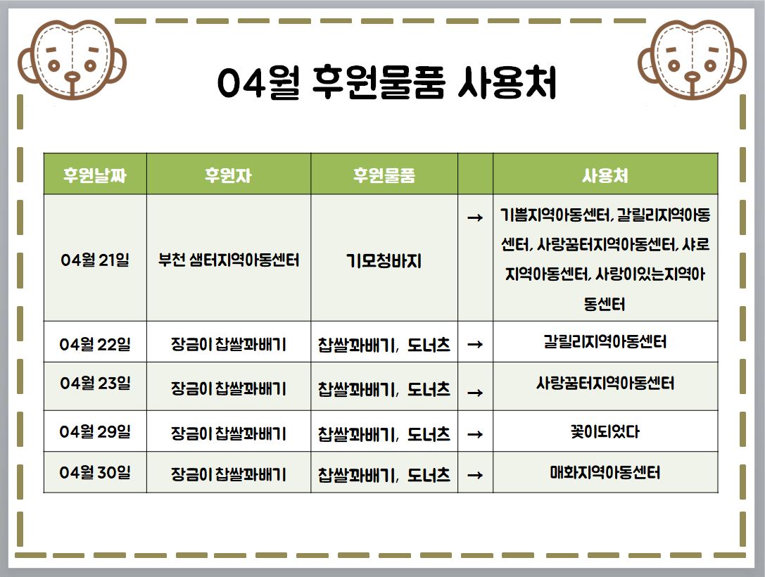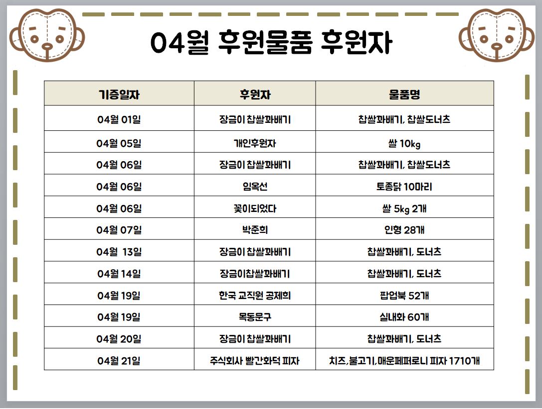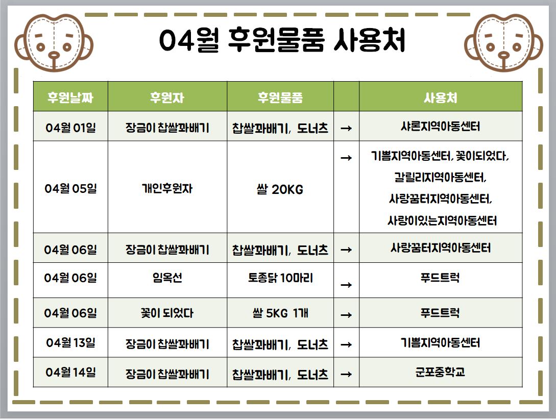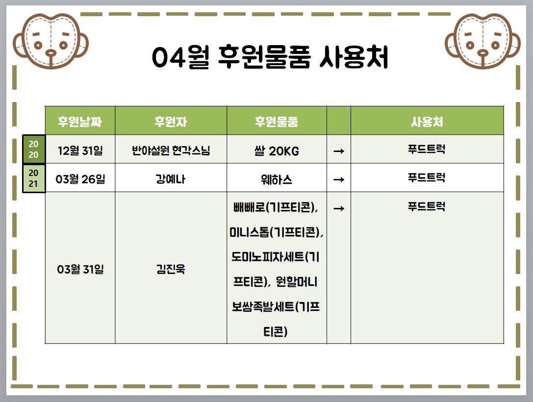 2021년 04월 후원물품 후원자, 후원물품 사용처, 후원금 사용내역, 자원봉사자 올려드립니다.